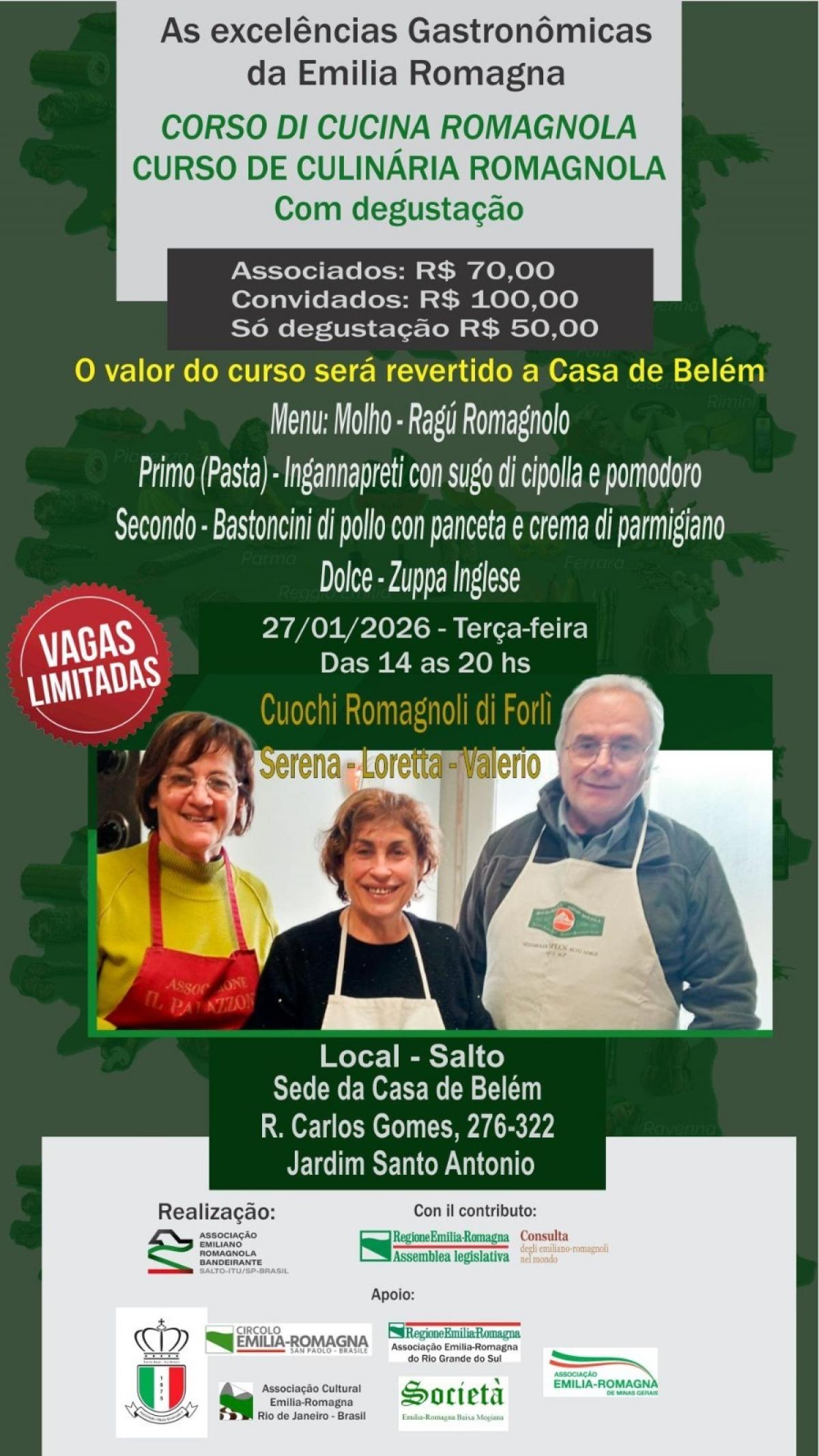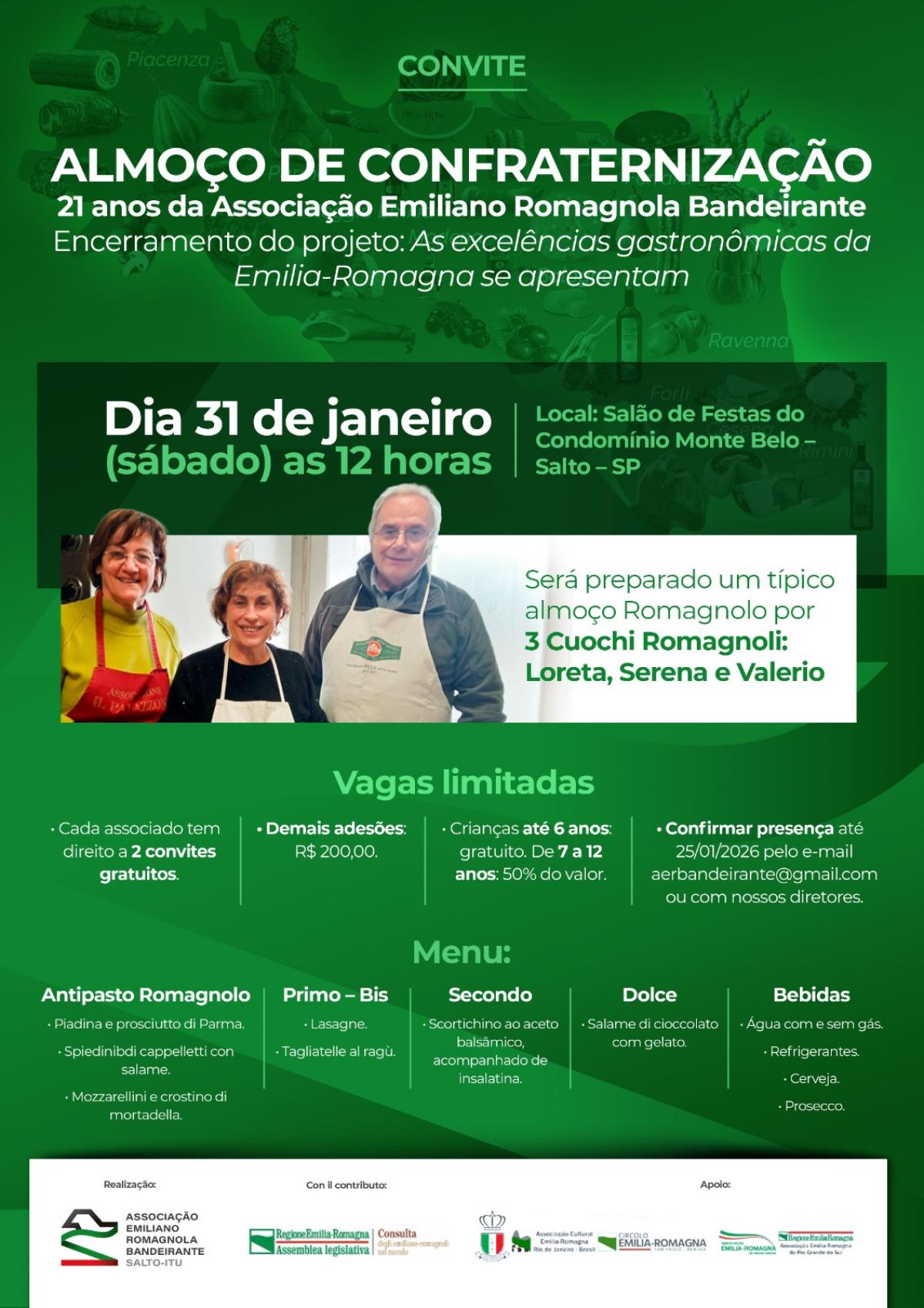 Il 31 gennaio 2026 il Trio di Cuochi Romagnoli preparerà un pranzo tipico romagnolo, utilizzando prodotti d'eccellenza della Regione Emilia-Romagna, per celebrare la chiusura del progetto e il 21° anniversario dell'Associazione Emiliano-Romagnola Bandeirante, al quale parteciperanno più di 100 persone.