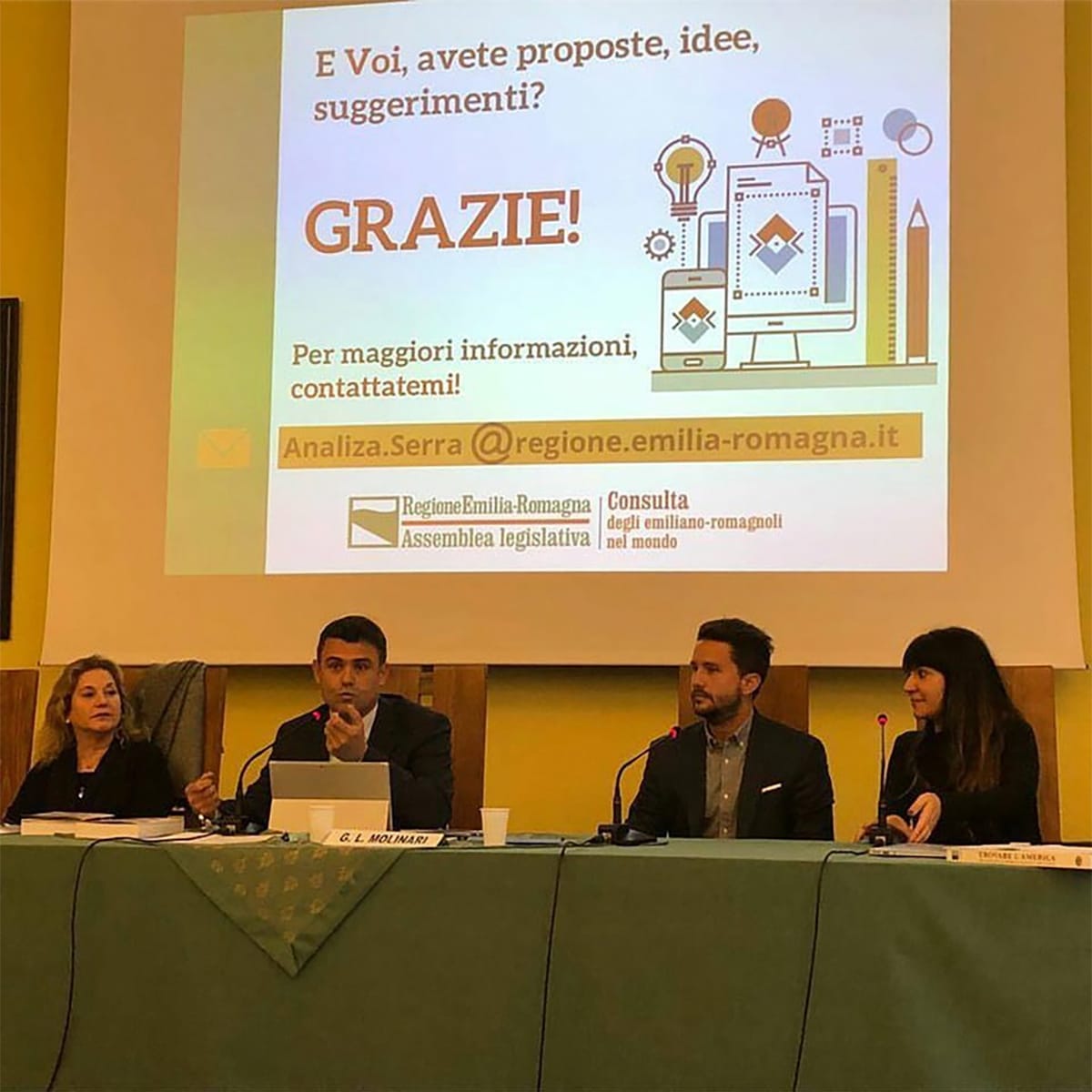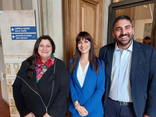 2022. Da destra a sinistra: Presidente della Consulta, Consigliere regionale Marco Fabbri; Vicepresidenti della Consulta, Consigliera regionale Valentina Stragliati e Marilina Bertoncini, consultrice residente all'estero. Mandato 2020-2024.