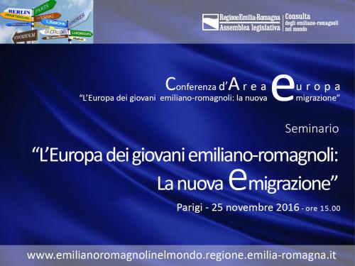Locandina Seminario “L’Europa dei giovani emiliano-romagnoli: la nuova emigrazione” in occasione della CONFERENZA D’AREA EUROPA della Consulta, Parigi, 24-25 novembre 2016