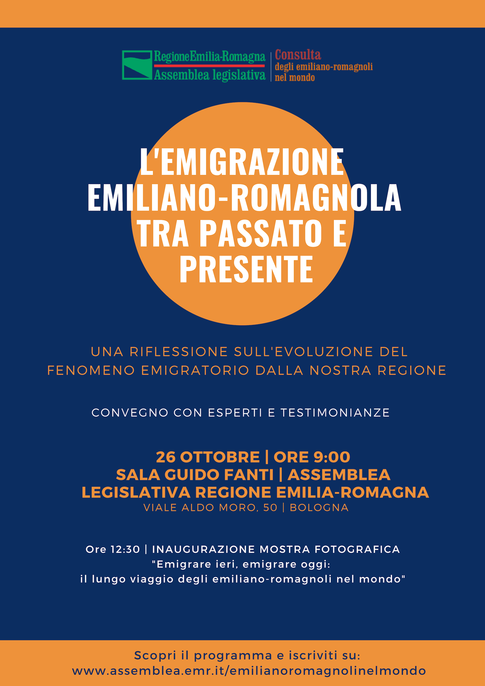 Locandina Convegno "L'emigrazione emiliano-romagnola tra passato e presente" - Bologna, 26 ottobre 2018. Convegno organizzato in apertura della Riunione della Consulta 2018.