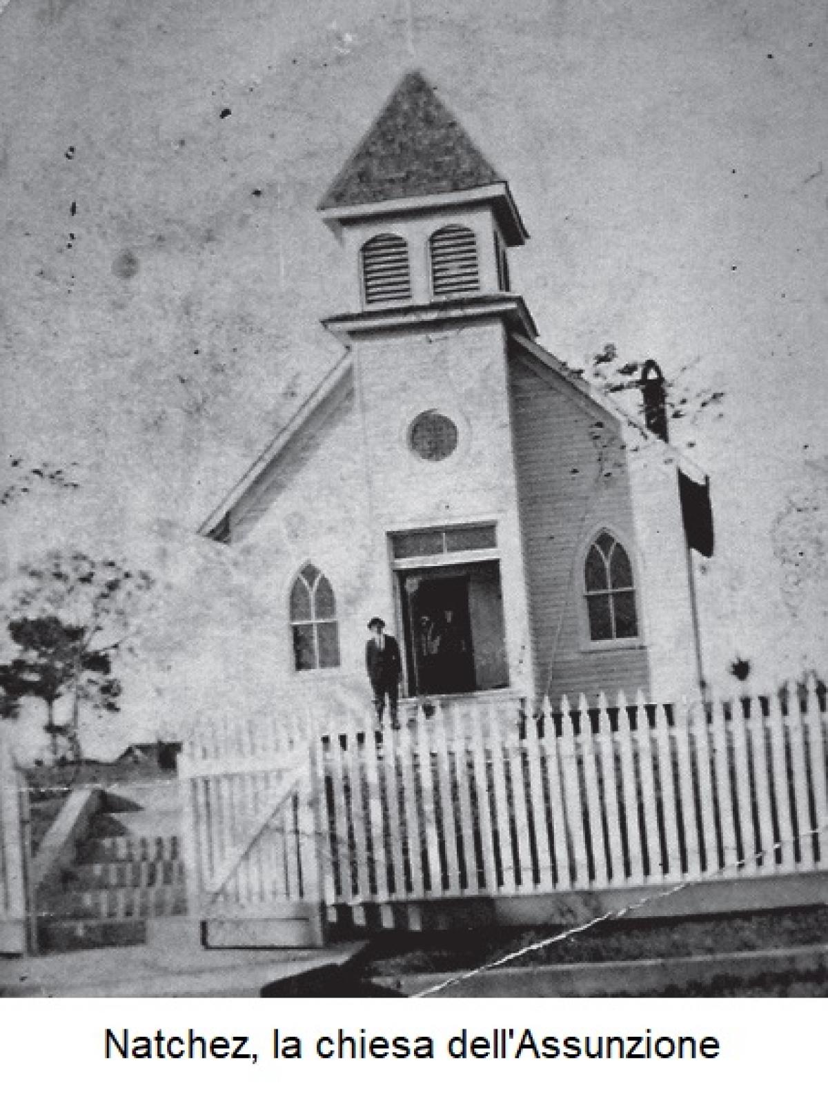 Una grande casa a due corpi disposti in perpendicolare, con la lunga veranda rialzata dal terreno sostenuta da colonnine, i camini, le finestre della mansarda. In quella casa viene anche celebrata per alcuni anni la messa domenicale, perché la chiesa cattolica di Natchez è lontana; questo finché mr. Lee Parker, il generoso ex padrone dei Verucchi, non dona un terreno sul quale padre Patrick Hayden costruisce coi suoi soldi, per la comunità italiana, la piccola chiesa dell’Assunzione.